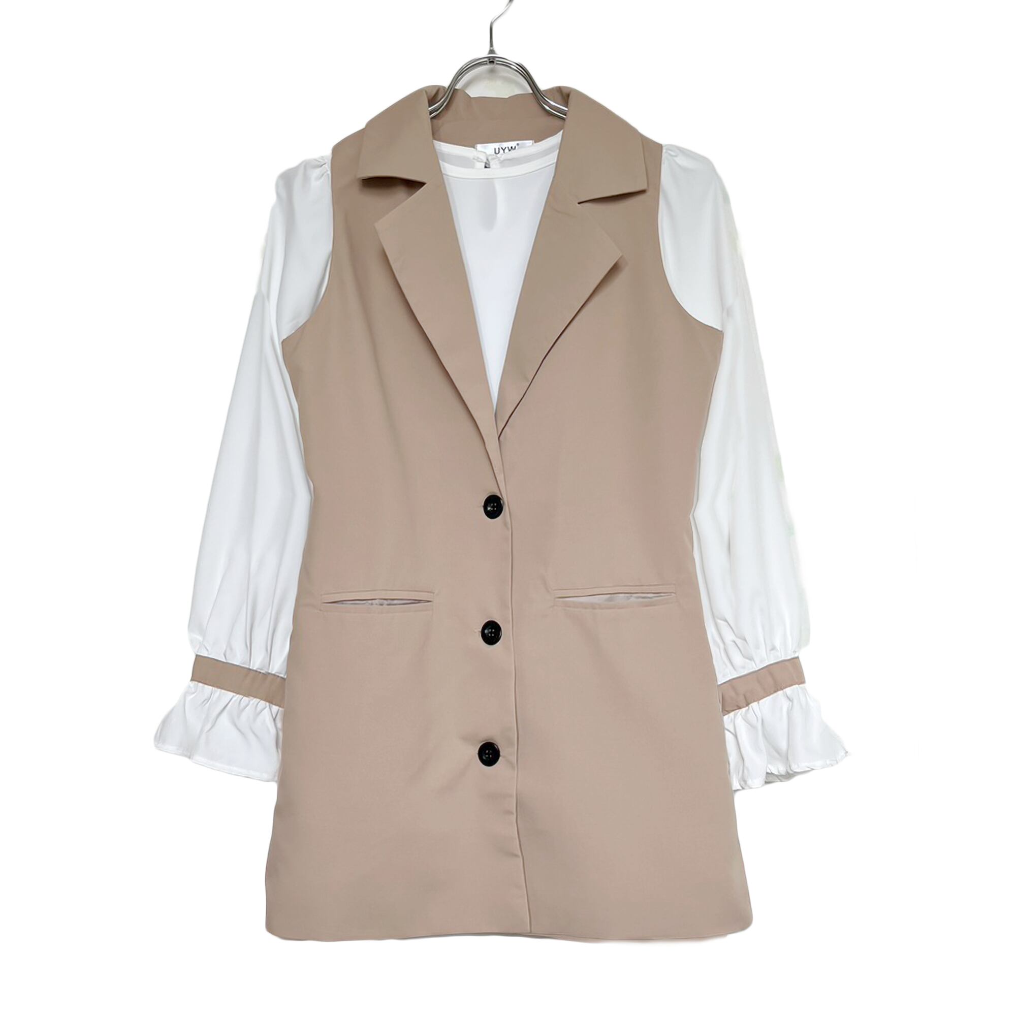 女の子らしいストラップカフスのブラウスに「きちんと感」をプラスするテーラードベストを合わせたセットアイテム。 ♥シルエット:Xライン ♥ストレッチ: ブラウス:なし ワンピース:なし ♥サイズ:M ブラウス 着丈:56cm 肩幅:33cm 袖丈:59cm バスト:94cm ワンピース 着丈:77cm 肩幅:33cm バスト:95cm ウエスト:95cm 生産国:中国