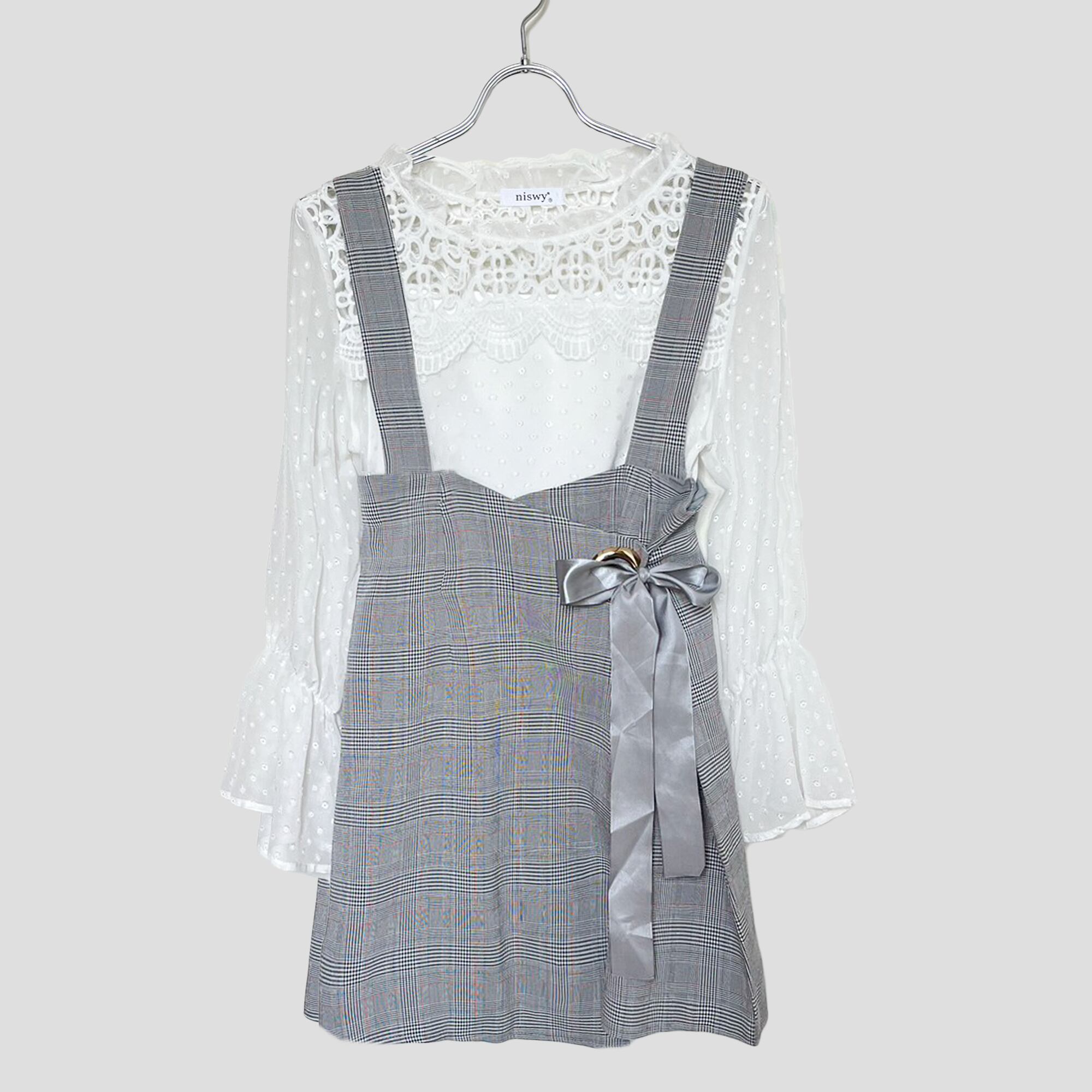 甘さと上品さが共存するコーデセット。レースがフェミニンなシフォンブラウスと、チェック柄ジャンスカが可愛らしいセットアイテム。リボンデザインがポイントで、女性らしい印象を与えます。着るだけで一気におしゃれ度がアップ。レースの透明感が引き立つフリルサーキュラーカフスと単色タータンチェックのラップリボンジャンスカをセットにしたガーリーアイテム。インナーキャミ付きの3点セット