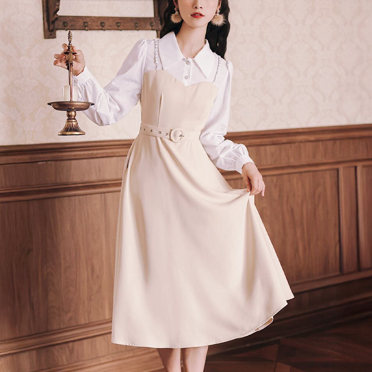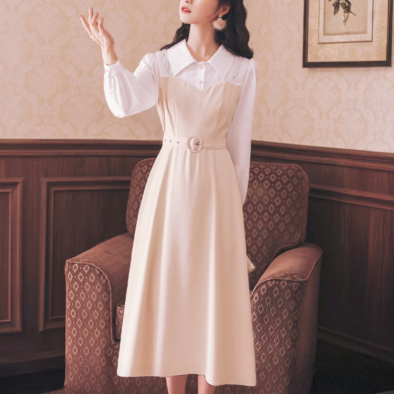 清潔感あるブラウスの雰囲気と美しいシルエットを映す、揺らめくハイウエストのフレアーな裾。スイートエレガントなユニオンワンピースです。 ・サイドファスナー ・メタルストラップ付き ♥シルエット:アンピール・ライン ♥ストレッチ:なし ♥サイズ:M 着丈:112cm 肩幅:37cm 袖丈:58cm バスト:93cm ウエスト:80cm 生産国:中国