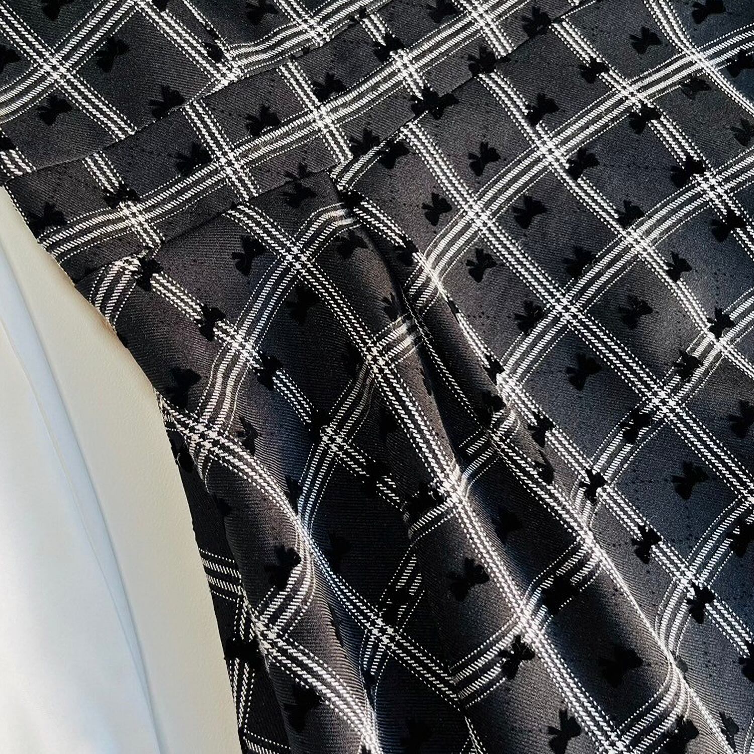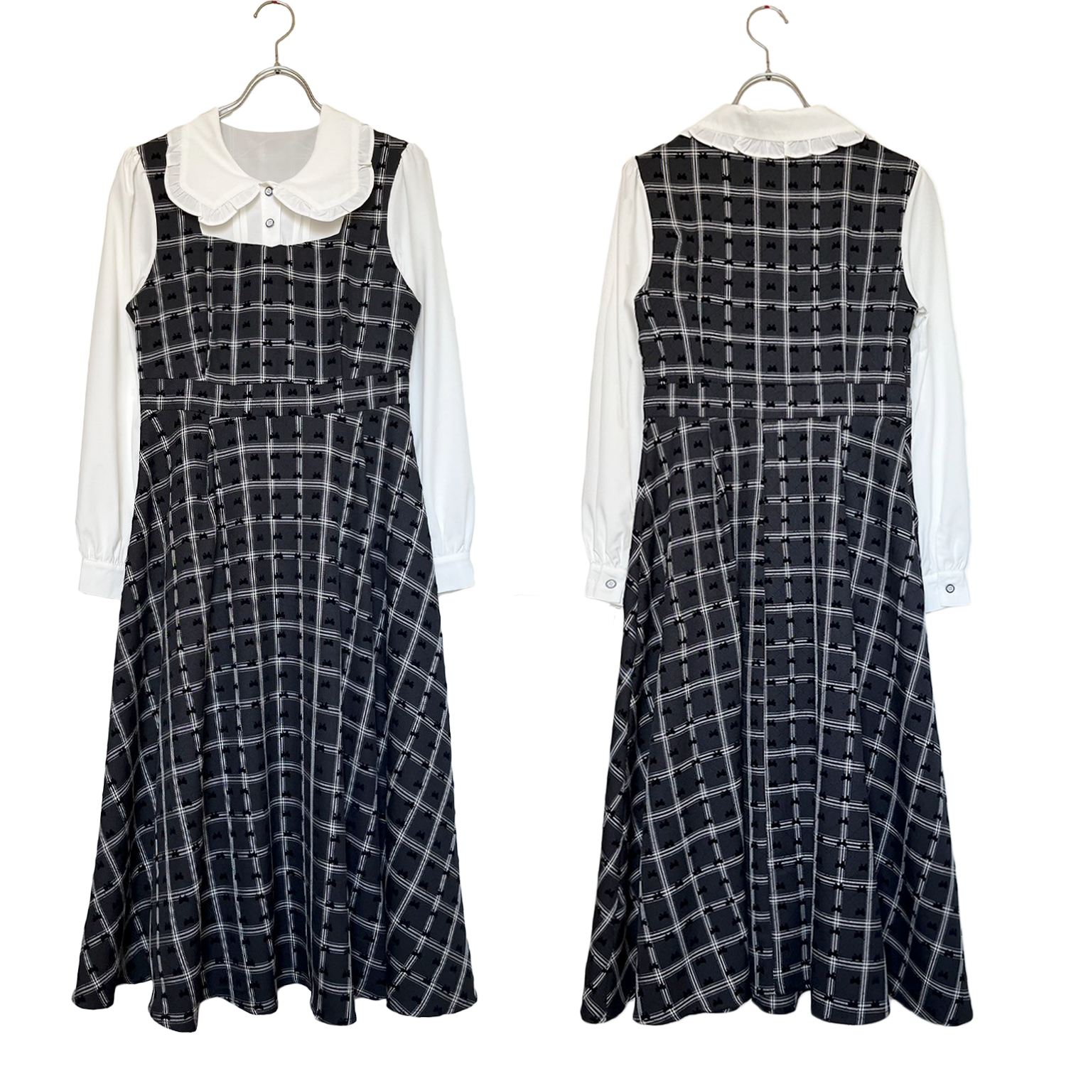 清潔感あるダイヤネックカラーブラウスとクラシカルな雰囲気を映す黒のチェックにさりげないリボンフロッキー加工を施したスイートエレガントなユニオンワンピース。 ・裏地あり、サイドファスナー ♥カラー:ブラック ♥シルエット:アンピール・ライン ♥ストレッチ:なし ♥サイズ:F(ワンサイズ) 着丈:114cm 肩幅:36cm 袖丈:58cm バスト:87cm ウエスト:73cm 生産国:中国