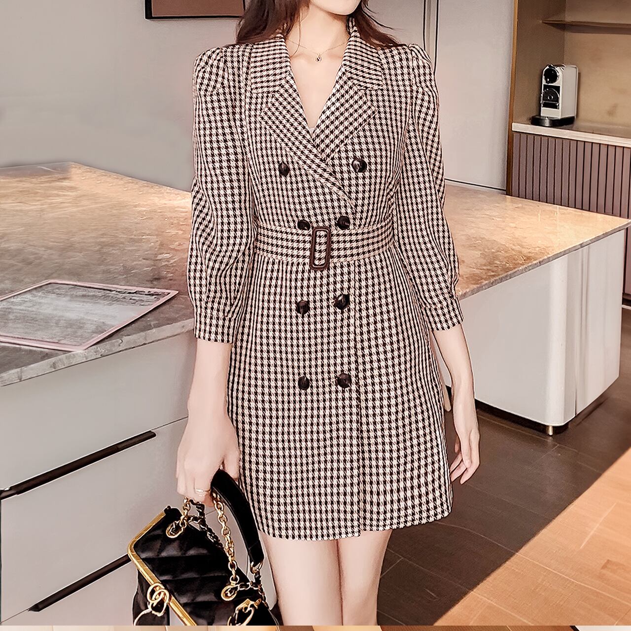 【 ワンピース】モカタータンチェックフレアペプラムワンピース