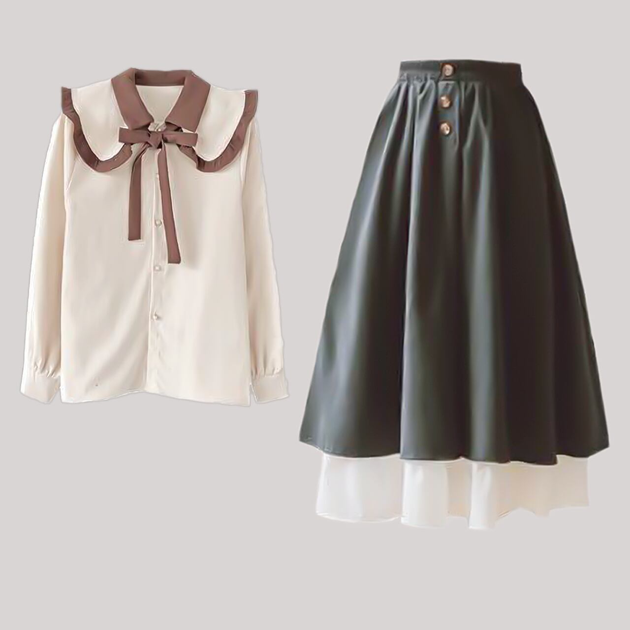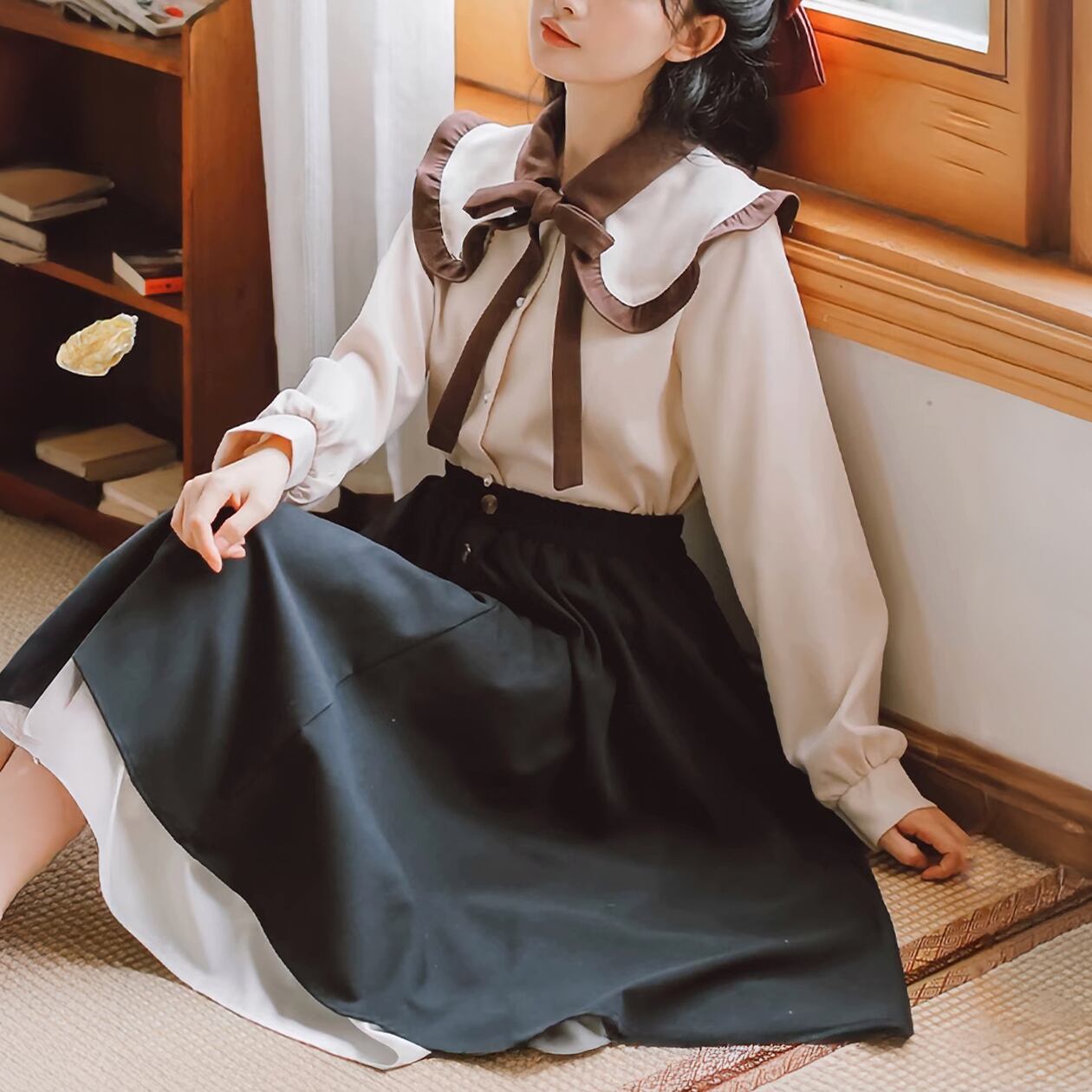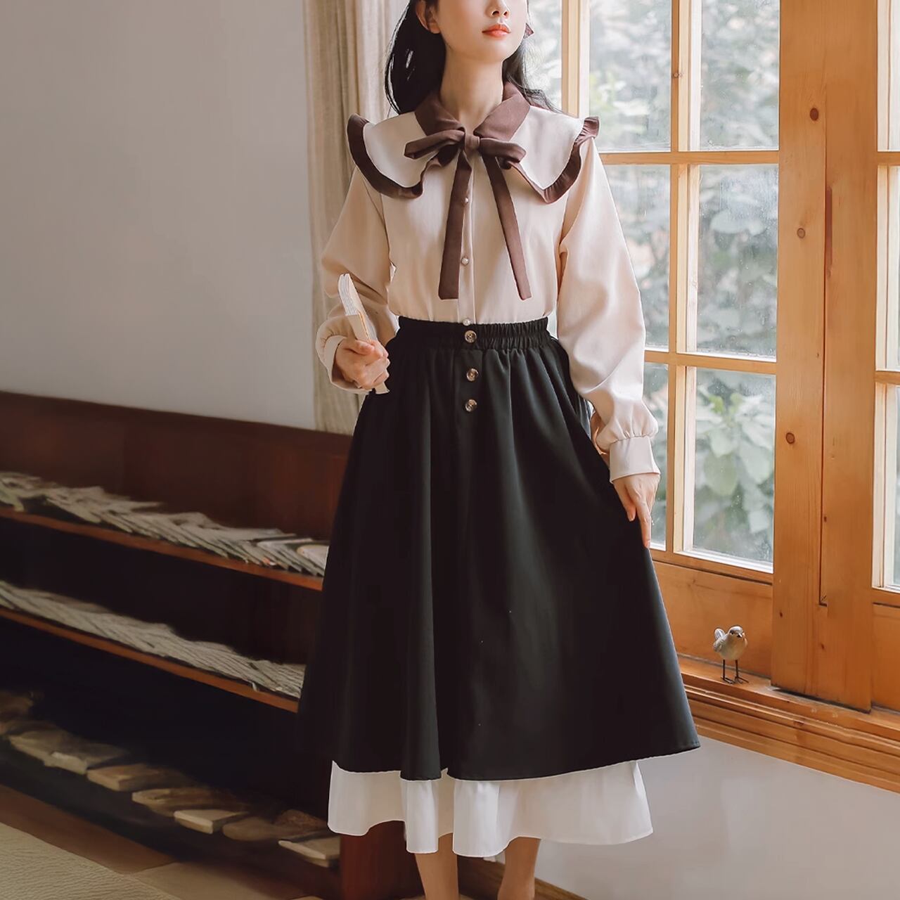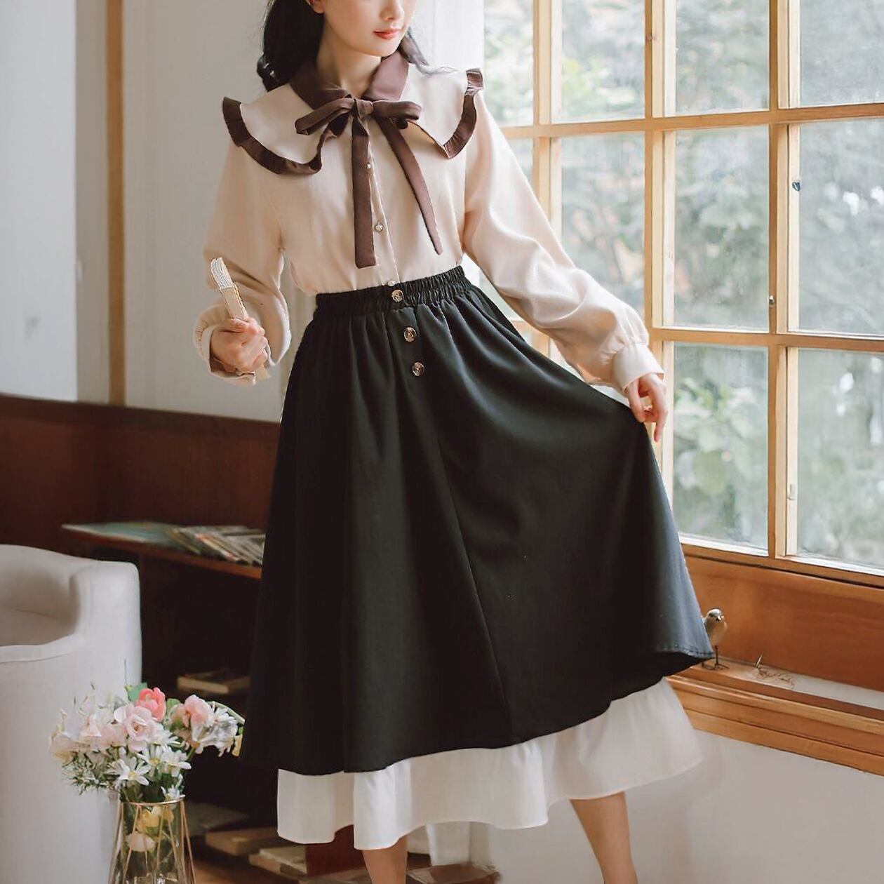 配色フリルのクワイボーイカラーブラウスとクラシカルな雰囲気のブラックとホワイトのティアードスカートのガーリーセットアイテム。