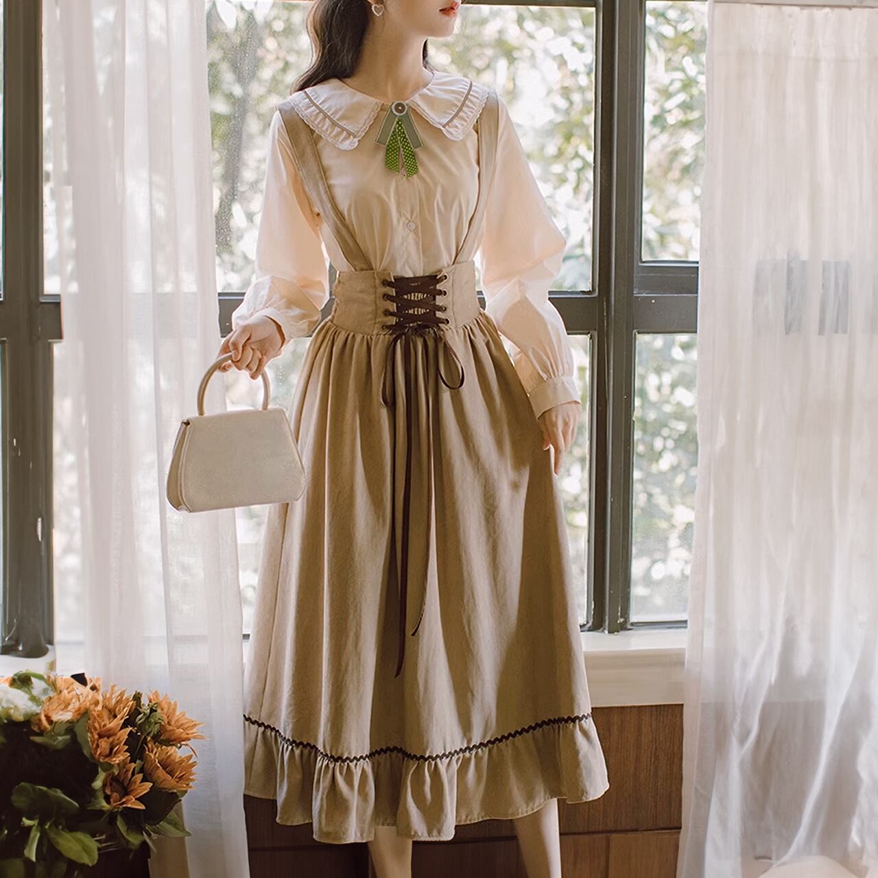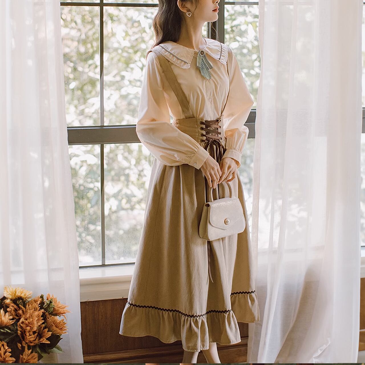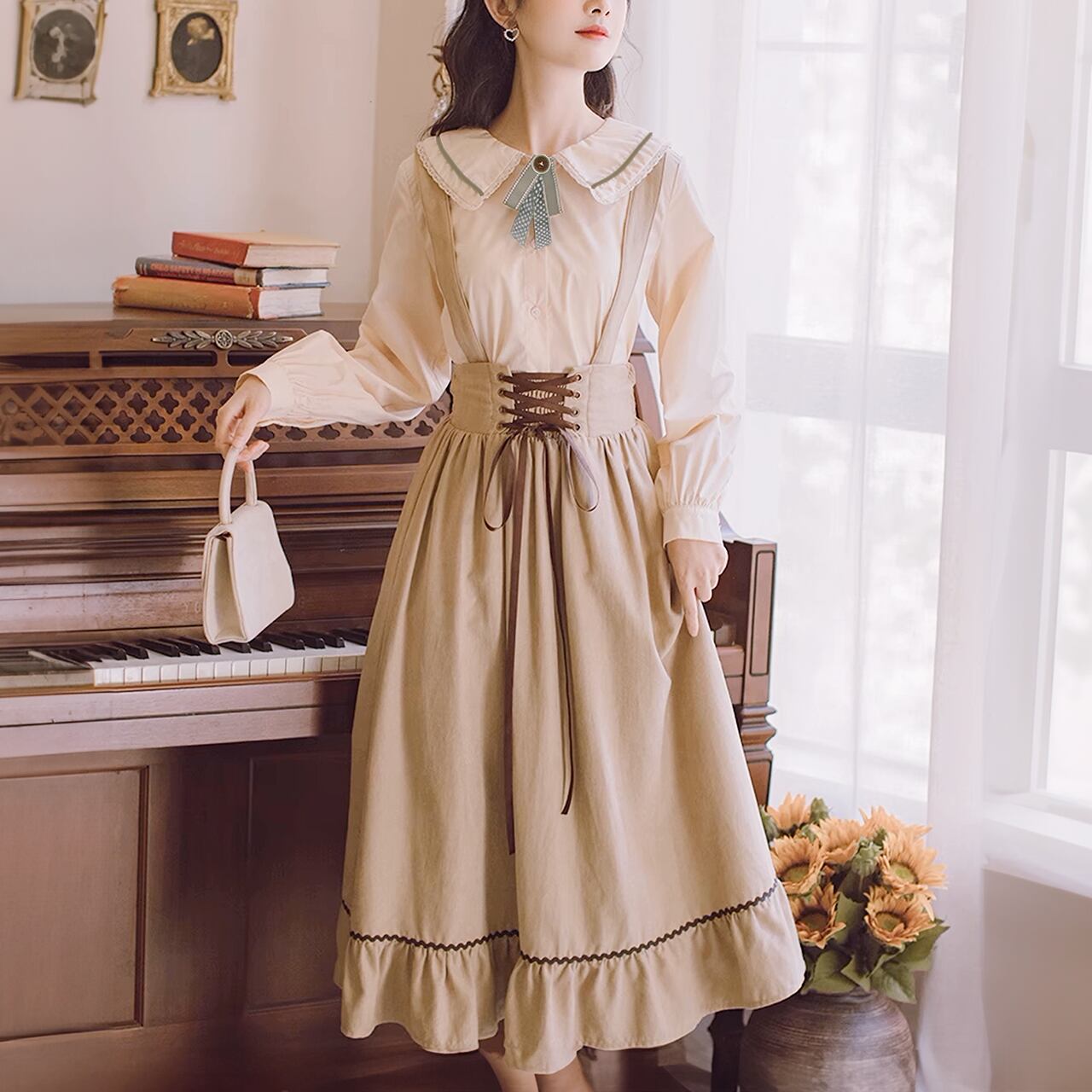 フリルを施したイートンカラーにクラシカルで可愛いラッフルカフスのシャーリングブラウスとレースアップギャザーのラッフルジャンスカのセット。クラシカルで甘いスタイリングが楽しめます。