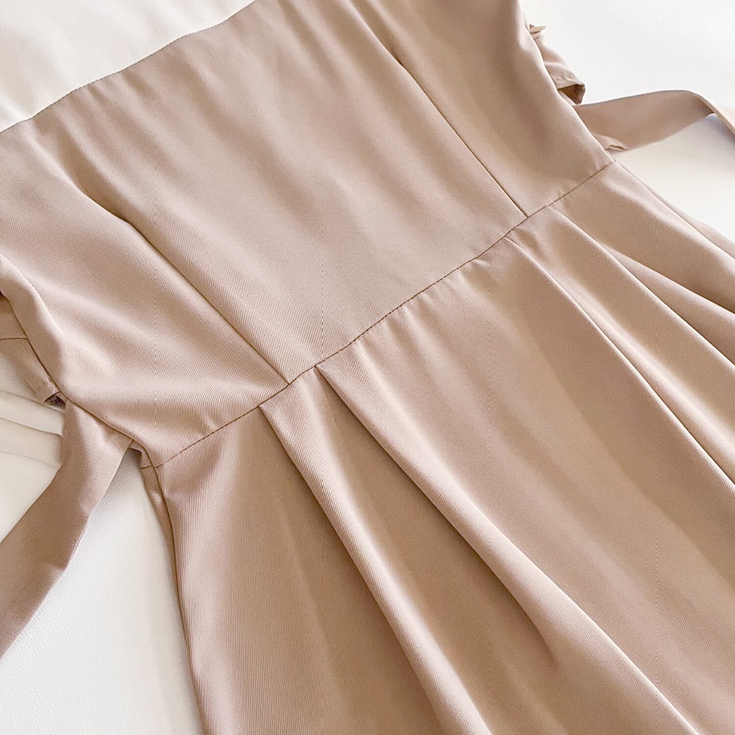 スタイリングにトラッドなエッセンスを加えるトレンチデザイン。スタイリングバランスの良いハイウエストとウエストリボンでお好みのシルエットを楽しんでください。 ♥カラー:ベージュ ♥ストレッチ:なし ♥サイズ:表記サイズ:S 着丈:106cm 肩幅:36.5cm 袖丈:57cm バスト:87cm ウエスト:72cm 生産国:中国