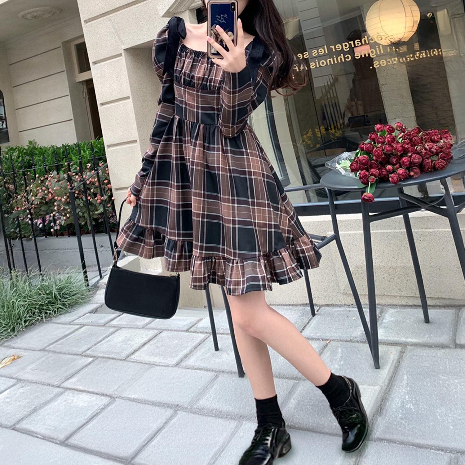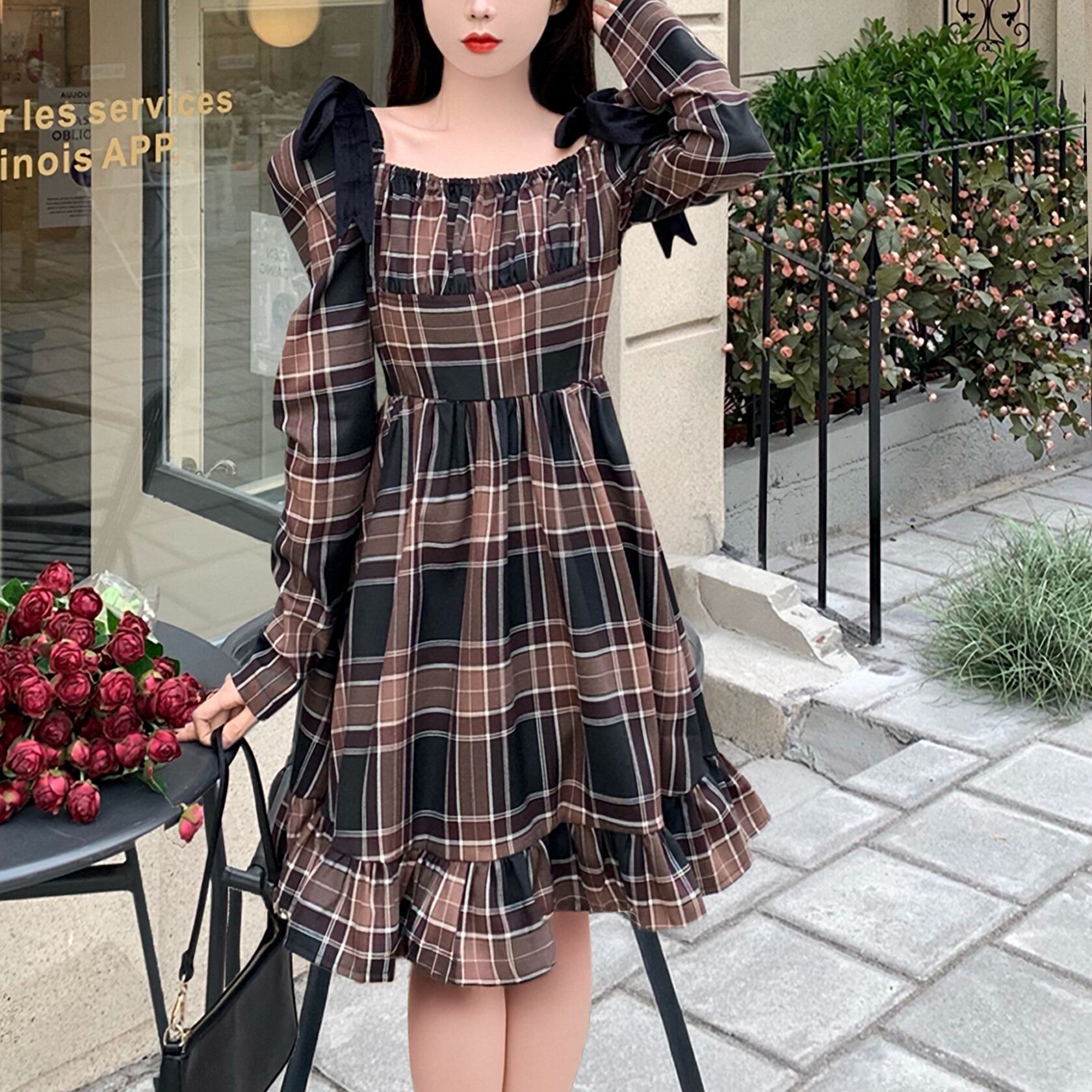 可愛らしく秋映えするチェックのデザインを活かした特徴のワンピースです。スクエアネックがフェミニンな印象を与え、タータンチェックが独特の味わいを醸し出しています。ウエスト切り替え部分にはストレッチギャザーが付いており、着心地が良く、動きやすい仕様になっています。ペプラムシャーリングによってフレア感がプラス。ショルダーストラップにリボンが付いたデザインがアクセントになっています。